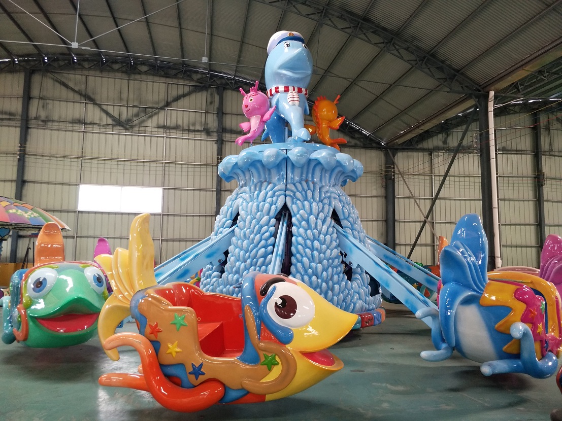 海洋總動員游樂場設備是許昌龍之盈游樂設備有限公司*新研發的一款水上旋轉類游樂設備。整套設備的色彩搭配和諧完美,清新亮麗;中間珊瑚島造型的底座托起幾只形態可愛的小丑魚,飛魚造型的座艙,卡通可愛,非常吸引游客尤其是小朋友的眼光。帶動座艙的大臂使用色彩鮮艷的玻璃鋼裝飾,工藝精良,外觀靚麗。產品集升降,旋轉于一體,增添了更多娛樂趣味。